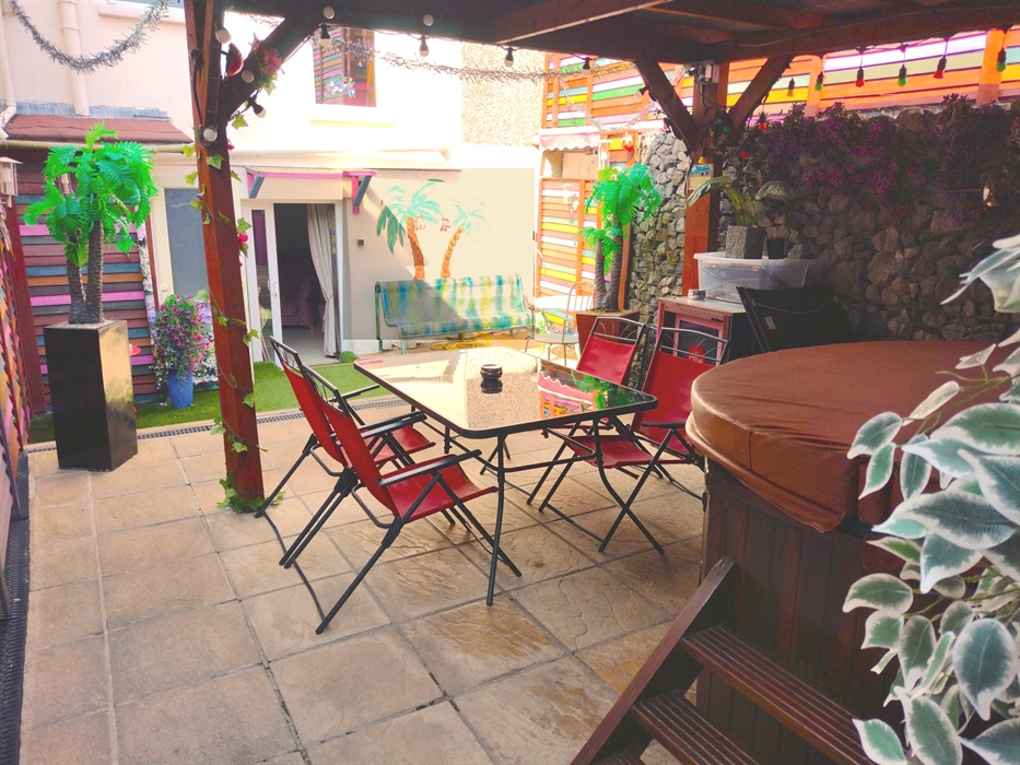 4 STARS RATED WITH VISIT WALES - Sleeps 7. ‘‘266’’ is Cosy and wood beamed. All Facilities are PRIVATE. King-size Master plus 1 twin-room and 1 triple-room. The triple can be changed to a Super-King and 1 single. The twin can be changed to a Super-King. {Cot/highchair available if needed.no extra charge} Full Bathroom PLUS a separate Shower Room. We also have a toilet on the terrace. New, fully equipped kitchen, with a cosy living room with dining area, featuring a stone wall with a set-in log fire, retaining beautiful original stone staircase features. Large private terrace with a Hot Tub and Cyprus Style Stone Barbecue. Large 'fairy-light' lit Gazebo over hot tub area so as to be able to enjoy the facilities all year round. Private, large rubber/resin all/weather floored playground with 2 climbing frames, swings and 2 slides. Covered bicycle lock-up for 7 cycles. Lock-up is also suitable for surfboard, beach equip etc. ~ Free Wi-Fi ~ free Parking outside. Sorry no pets.