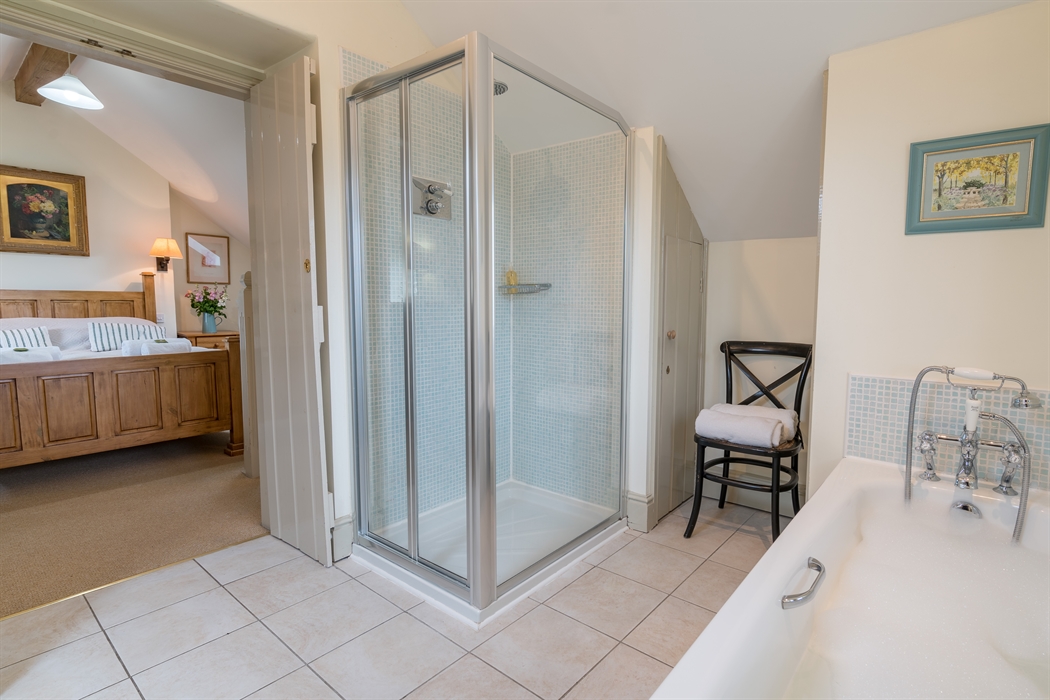 The spacious bathroom has a separate shower and a bathtub.