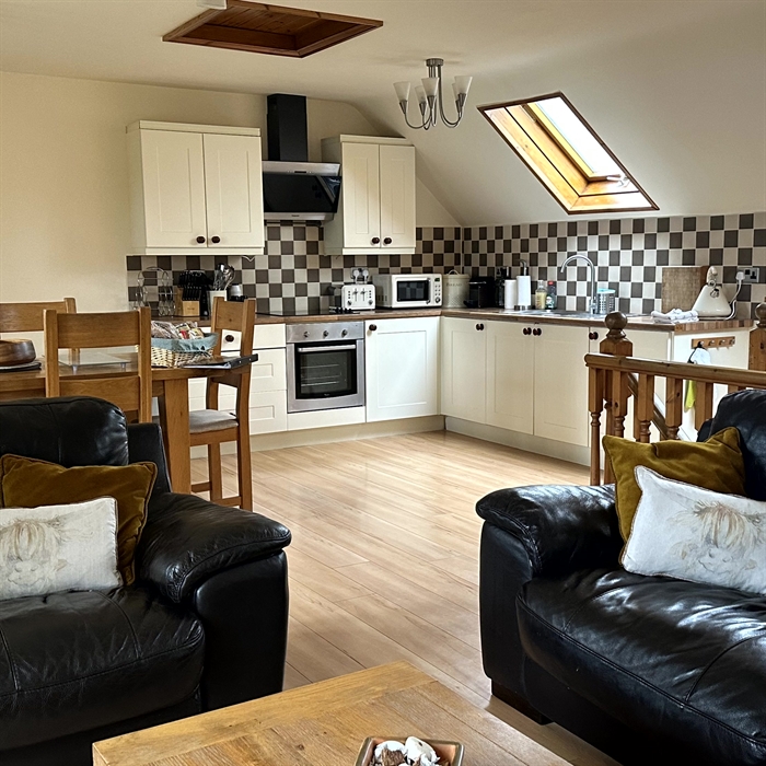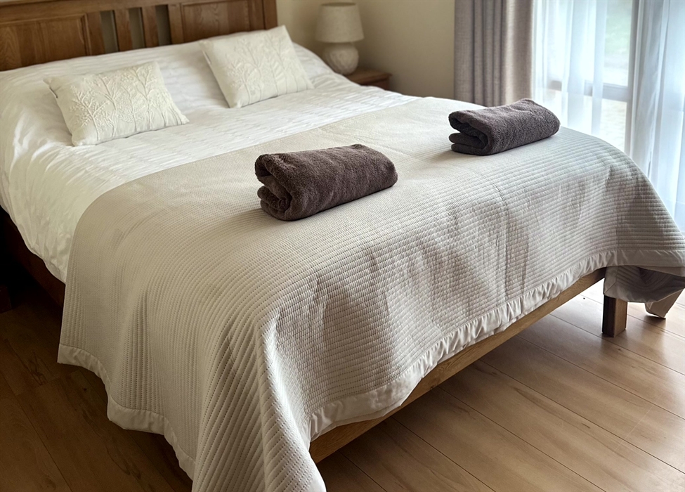 The open plan living accommodation is on the first floor which has 2 sets of French windows looking out onto the beautiful Gower countryside. The fully equipped kitchen, dining and lounge areas are designed with efficiency and comfort in mind. The focal point of the lounge is a log burner together with a wall mounted flat screen TV, wireless internet connection, and Sky. There is also a utility area with dishwasher, washing machine and tumble dryer.