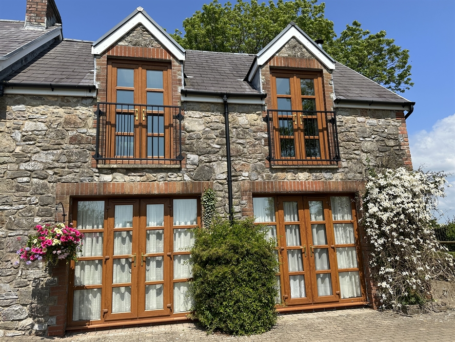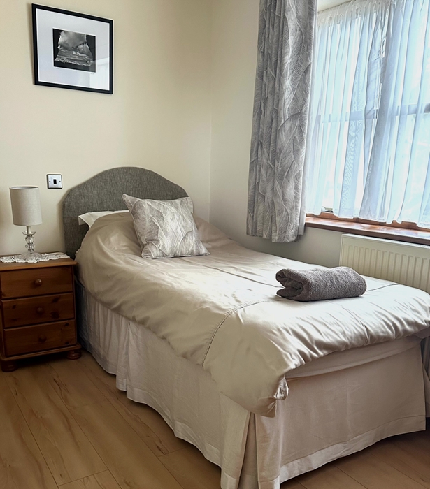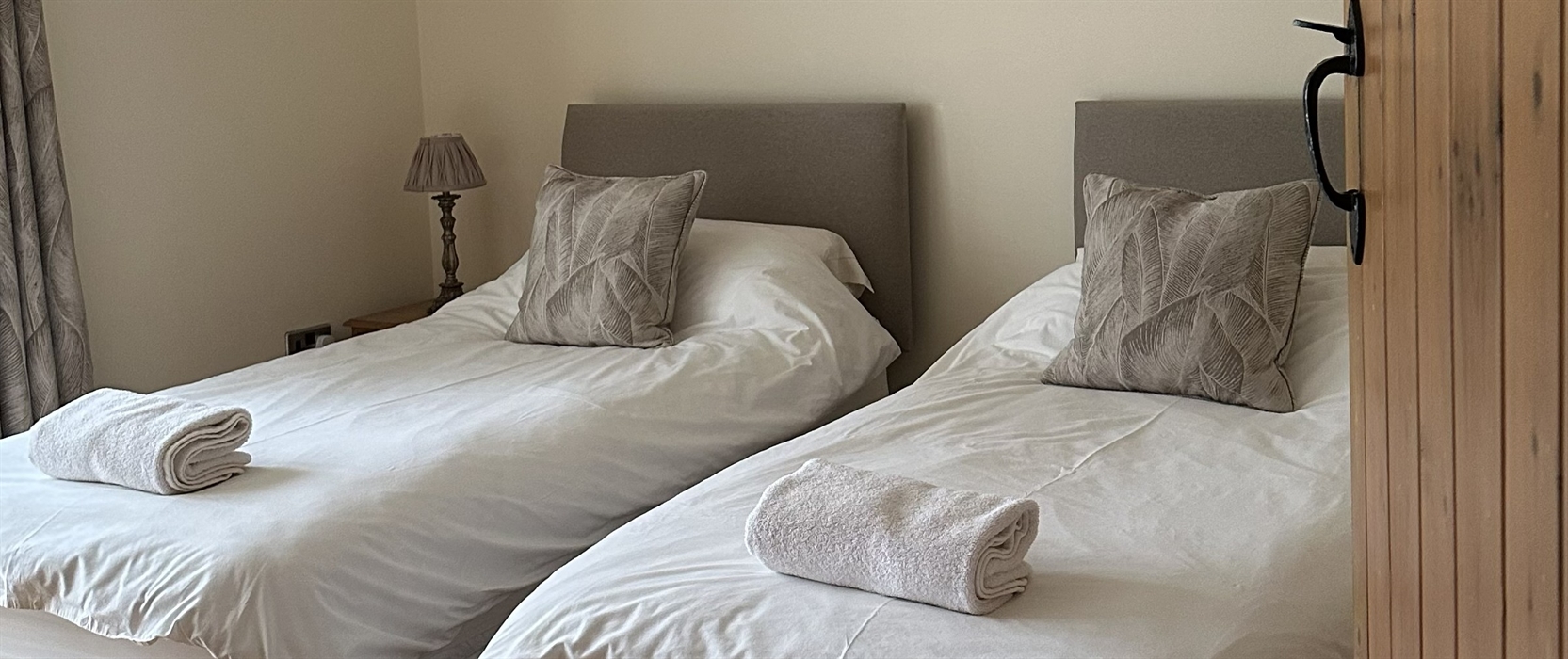 The sleeping accommodation on the ground floor is three bedrooms, one double, one twin with en-suite and one single (with pull out divan option). The double and twin have French windows opening onto a paved area at the front of the cottage. The bathroom has bath and shower, with shaver point etc.
