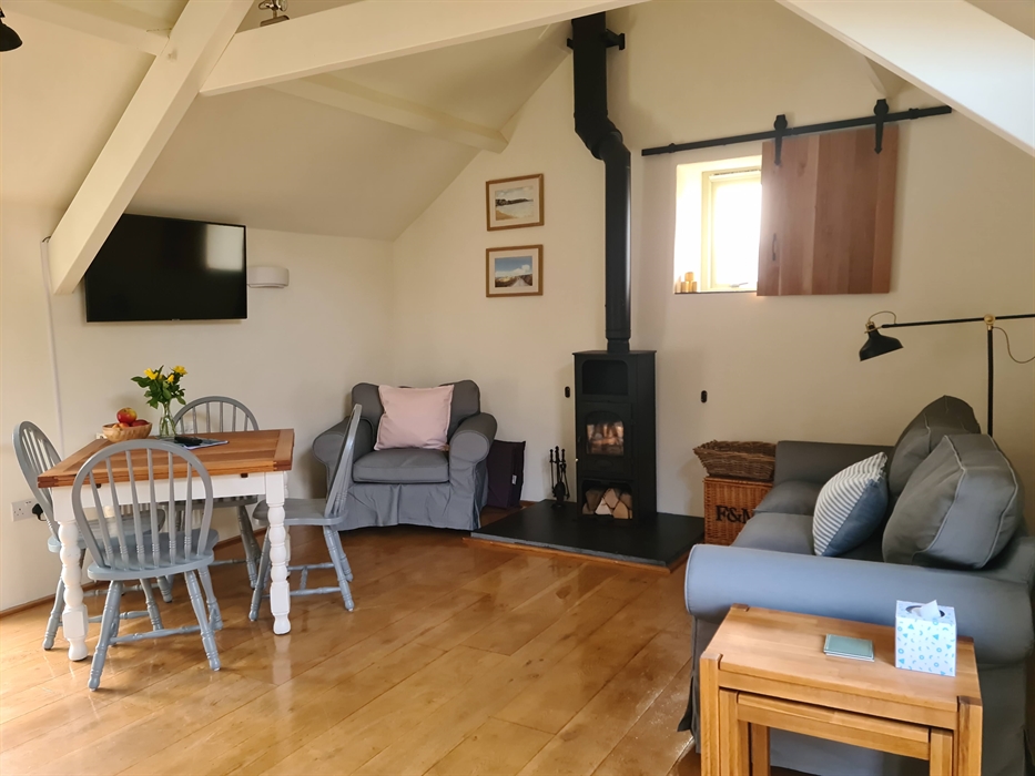This open plan A-frame upstairs room has lots of character, with an exposed stone wall separating it from the barn room. It contains a fully equipped kitchen including dishwasher and espresso machine. The dining and living area has a roomy table and comfy seats around the log burner.
