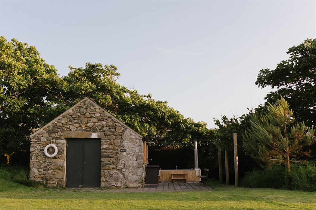 Beyond the doors lie five acres of meadows, ponds and green lanes, gently rewilded since 2009 and alive with birdsong. Follow the stream for a soak in the wood-fired bath or wander down to your own private beach for swimming, beachcombing and spectacular sunsets. At low tide, a wide sandbank appears — perfect for paddling, kayaking and wild play. As night falls, stars fill the sky, the firepit crackles, and the sea provides the soundtrack.