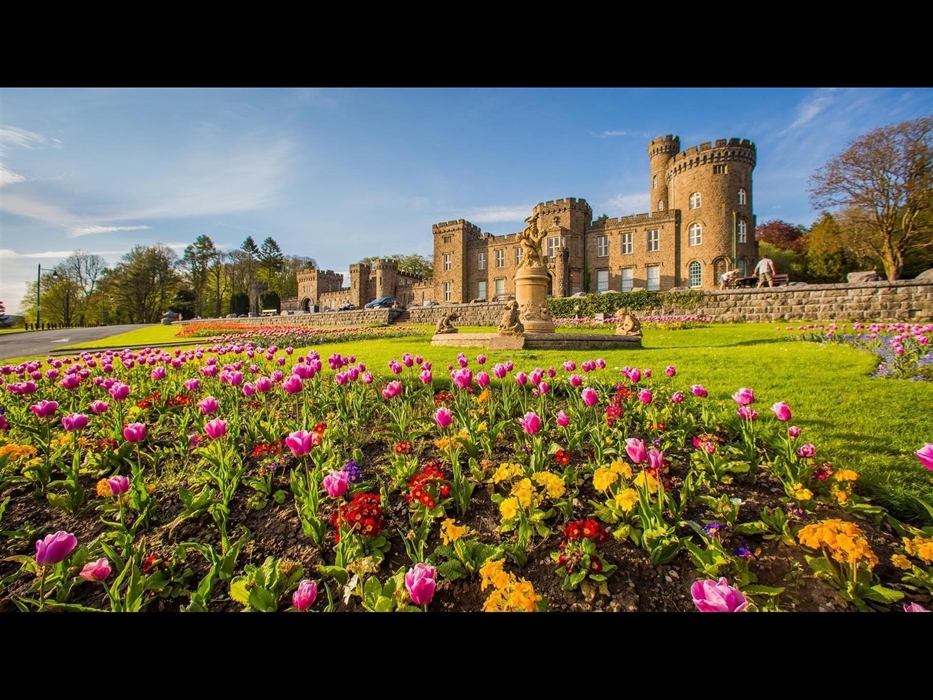 The castle is set in 160 acres of parkland with formal gardens, a lake, children's play area, and a model railway. The tearoom offers delicious food and outdoor seating, perfect for summer relaxation.