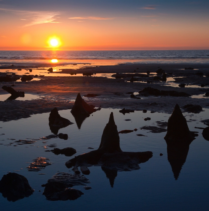 Planen Sie Ihre Yogastunde im Rhythmus der Gezeiten, um die versunkenen Wälder von Mittel- und Westwales zu erleben. Bei Ebbe werden am Strand Baumstümpfe eines jahrtausendealten versunkenen Waldes aus der Bronzezeit sichtbar. Diese Wälder stammen aus der Bronzezeit und tauchen an verschiedenen Stränden entlang der walisischen Küste auf, z. B. in Borth, Tywyn und Freshwater West, Pembrokeshire, wenn die Ebbe am niedrigsten ist.
