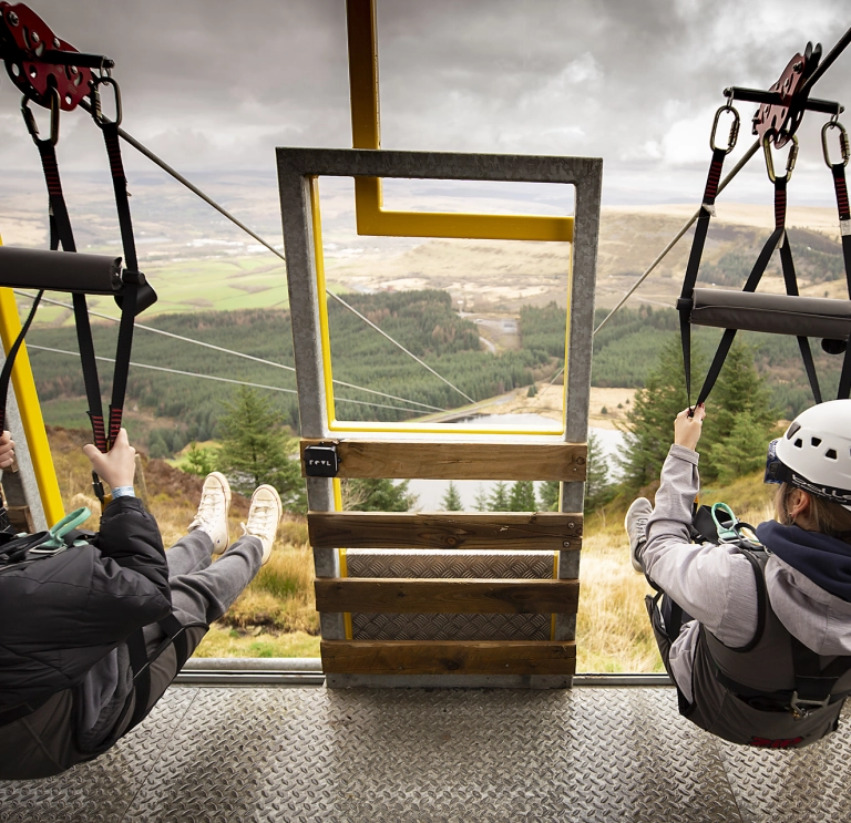 Der Tower Flyer besteht aus insgesamt drei Ziplining-Zonen mit einmaliger Aussicht auf die Rhigos Berge. Die erste Seilrutsche ist 115 Meter lang. An ihr saust man entlang der historischen Tower Colliery zum zweiten Turm. Anschließend geht es an der zweiten 80 Meter langen Zipline zum dritten Turm, bevor man nach weiteren 75 Metern sicher auf dem Boden, direkt neben der Cegin Glo Bar und dem Bistro landet – der perfekte Zeitpunkt für eine Erfrischung nach dem Abenteuer.