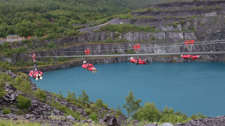 In einem ehemaligen Schiefersteinbruch bei Blaenau Ffestiniog, im Eryri (Snowdonia) Nationalpark, kann man auf der längsten Zipline Europas in drei Etappen die Berge hinuntersausen. Ein großartiges Abenteuer, das spektakuläre Ausblicke über die eindrucksvolle Schieferlandschaft der Region garantiert. Wem die Höhe nicht liegt, auf den wartete auf dem Gelände mit Bounce Below ein Abenteuer der Extraklasse: In einer ehemaligen gigantischen Höhle der Schiefermine kann man auf großen Trampolinen hüpfen und an Ziplines, Traversen und Höhlenwänden seine Kletterkünste und Geschicklichkeit unter Beweis stellen.