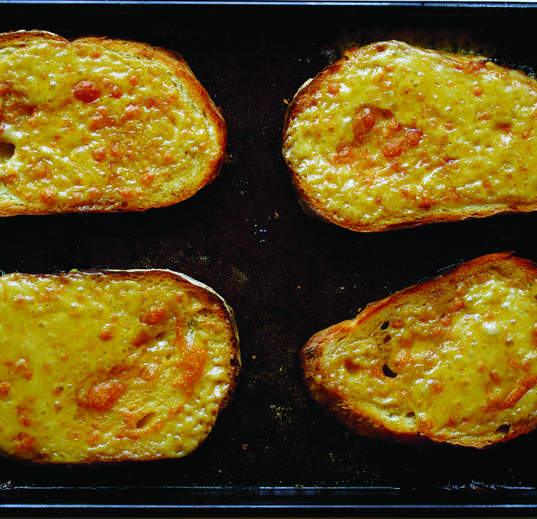 01 Den Käse reiben und zusammen mit der Butter, der Worcestershire Sauce, Senf, Mehl und Pfeffer in einen Kochtopf geben. Gut mischen und bei niedriger Temperatur erhitzen. Nach und nach das Bier hinzufügen. Die Mischung darf feucht, aber nicht zu flüssig werden. Weiterrühren bis die Masse geschmolzen und dickflüssig ist, dann vom Herd nehmen und etwas abkühlen lassen.