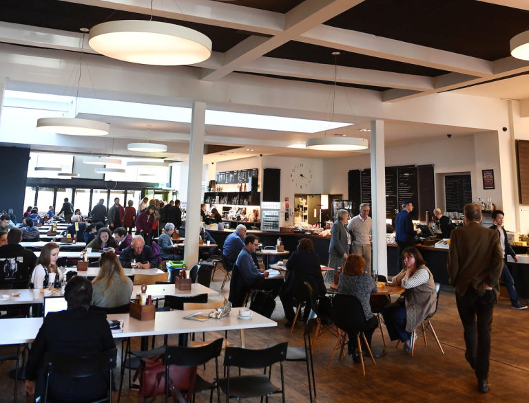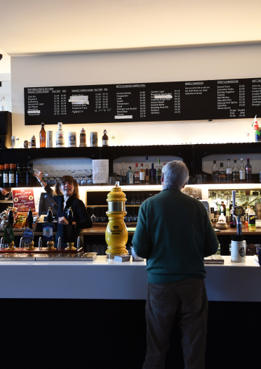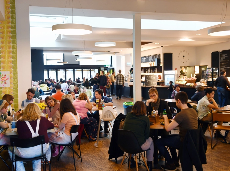 Die ganztägig geöffnete Café-Bar ist das Bindeglied in der Mitte des Gebäudes. Der lichtdurchflutete Bereich (mit umweltfreundlicher Beleuchtung) ist ideal, um mit Freunden etwas zu essen und zu trinken, neue Bekanntschaften zu schließen, um am Laptop in kreativer Umgebung zu arbeiten, für zwanglose Treffen oder um sich vor und nach einer Veranstaltung im Chapter zu stärken. Die saisonal-regionale Speisekarte bietet für jeden etwas, von kleinen Snacks bis hin zu Hauptgerichten. Der Kaffee kommt von der wunderbaren Rösterei Hard Lines (die Straße runter). Er passt perfekt zu einem der leckeren Kuchen oder Kekse.
