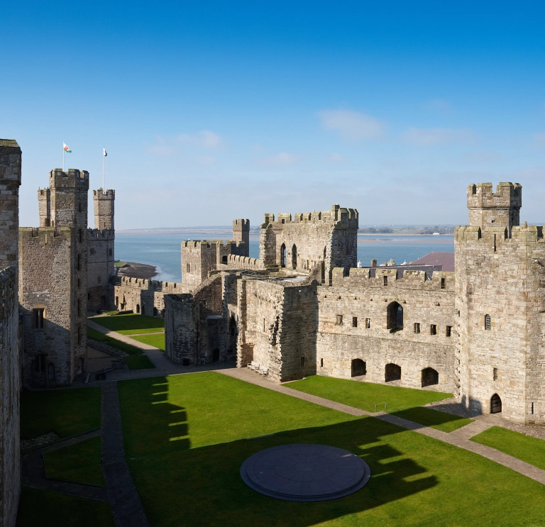 Sobald man den Burghof betritt, wird die eindrucksvolle Größe deutlich. Auf der Rasenfläche fand 1969 die Investitur von Prinz Charles, dem heutigen König Charles III., zum Prince of Wales statt. Vom hohen Eagle Tower aus hat man einen wunderbaren Rundumblick über die Stadt, auf die Menai Strait und zur Insel Anglesey.