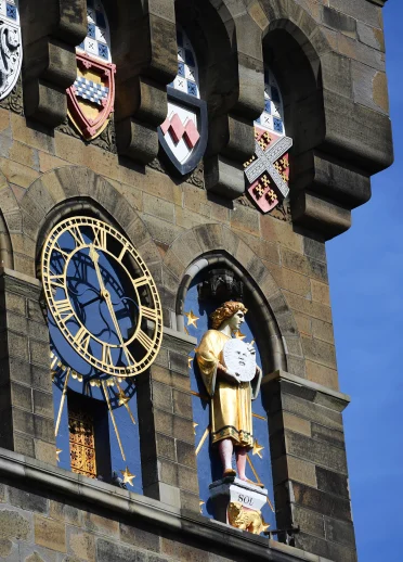 Es gibt kaum etwas prächtigeres, als das extravagante gotische Meisterwerk des Architekten William Burges, das dieser für den dritten Marquess of Bute schuf. Der über 40 m hohe Uhrturm ziert die Südwestecke des Cardiff Castle. Er ist prunkvoll mit bunt bemalten Ornamenten und Statuen verziert, die das Sonnensystem darstellen. Schon bei seiner Fertigstellung im Jahr 1874 erregte er großes Aufsehen und ist auch heute noch spektakulär. Im Inneren führt eine Wendeltreppe zu den einst großzügigen Gemächern des Lord Bute und zur Turmuhr, die von Edward Dent aus London gefertigt wurde. Er hat auch die Turmuhr für den berühmten Big Ben geschaffen.