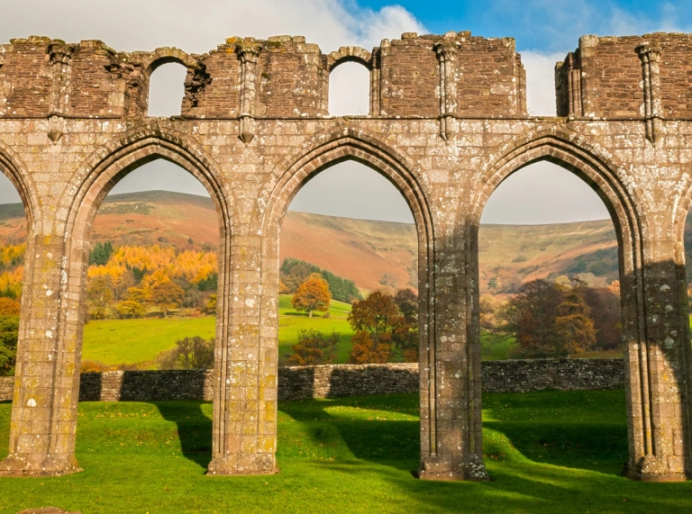 Bei unserer ersten Tour nach Wales sind wir mit dem eigenen Van über England angereist. Erste Station war ein lauschiger Campingplatz an der walisisch-englischen Grenze, in der Nähe der Llanthony Priory, am Rand von Bannau Brycheiniog, dem Brecon Beacons Nationalpark. Noch bevor wir unser Lager errichtet hatten, machten wir einen Spaziergang in den umliegenden Hügeln. Bauernhöfe mit ihren Feldern wechseln sich mit kleinen verwunschenen Wäldchen ab. Wir wateten durch einen glasklaren Bach und deckten uns in einem Hofladen mit frischem Brot, selbstgemachten Käsecrackern und Schinken ein.