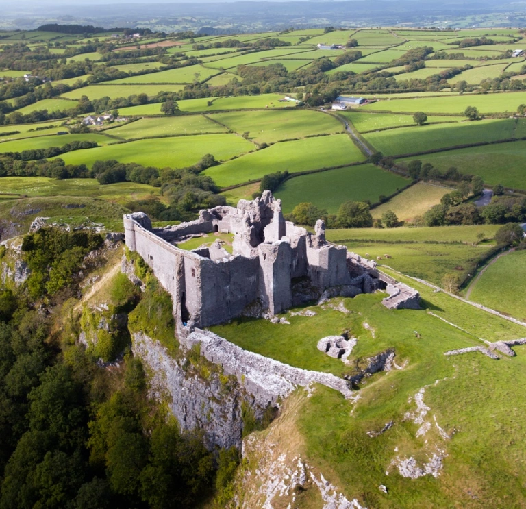 Der Aufstieg zum Carreg Cennen Castle ist zwar etwas steil und anstrengend, aber die atemberaubende Aussicht über die Landschaft von Carmarthenshire ist die Mühe wert. Diese „Burg in der Burg“ wurde auf einem Kalksteinfelsen errichtet und hat ein beeindruckendes zweitürmiges Torhaus. Die walisischen Prinzen von Deheubarth errichteten die erste Burg in Carreg Cennen, doch die heute noch erhaltenen Burgruinen gehen auf König Edward I. zurück. Diese äußerst romantische Burgruine, die eine Quelle der Inspiration für den berühmten englischen Maler J.W.M. Turner war, liegt etwa acht Kilometer südlich der Kleinstadt Llandeilo in einem abgelegenen Teil des Nationalparks und eignet sich hervorragend für Sternenbeobachtungen. Die Burg ist hundefreundlich und Ausgangspunkt für zwei Rundwanderwege.
