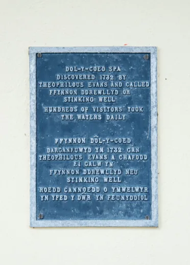Die Quelle, die den einstigen Kurort Llanwrtyd Wells berühmt gemacht hat, wurde in den letzten Jahren erschlossen. Dolycoed Spring ist eine Schwefelquelle, die immer noch sprudelt – man kann sie riechen, bevor man sie sieht! Es gibt sogar einen kleinen Pavillon über der Quelle, falls wir walisischen Regen bekommen, was ja vorkommen kann. Im Park gibt es auch einige schöne Kurhäuser, die jetzt private Cottages sind, ein altes Bootshaus und ein Pumpenhaus.