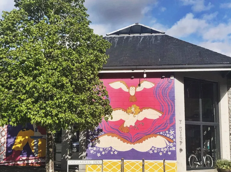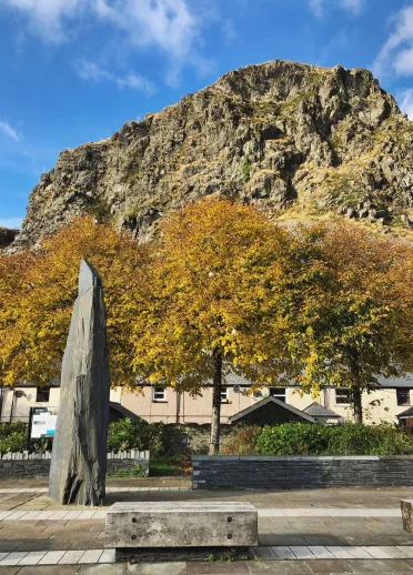 Blaenau entstand durch die Schiefersteinbrüche des 19. Jahrhunderts und es ist nicht schwer, noch heute diese Einflüsse auf die Stadt zu erkennen. So werden Besucher gleich am Eingang zum Stadtzentrum von mehreren hohen Schiefersäulen begrüßt, die für die historischen und kulturellen Wurzeln von Stadt und Region stehen. Im Kontrast hierzu das große bunte Gemälde der Künstlerin Lleucu Gwenllian auf einer Häuserwand an der gegenüberliegenden Straßenseite des kleinen Bahnhofs, das Szenen der regionalen Mythologie darstellt.