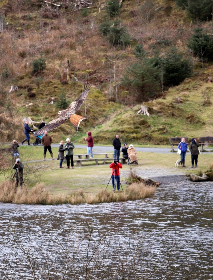 Bwlch Nant yr Arian Visitor Centre is one of the best places in Cymru to see red kites. These magnificent birds swoop in each afternoon to be fed as part of a long-running conservation programme. The all-ability Barcud Trail leads from the eco-friendly visitor centre to the edge of the lake where feeding takes place. Find out more at the Bwlch Nant yr Arian website.