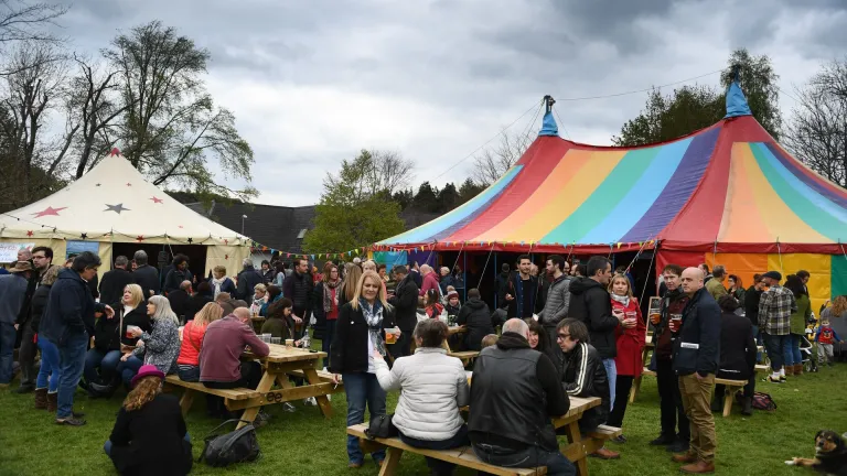 Two large colourful tents surrounded by many people drinking and having a good time.