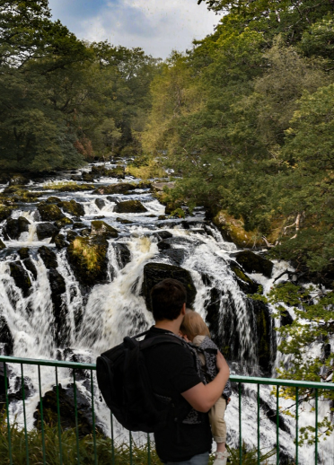 We woke early for breakfast at the hotel (which included a portion of sausage and bacon for Teddy!), then hopped in the car to reach our first stop of the day, Swallow Falls. It’s one of those magical natural spots, where the Llugwy River cascades over a narrow section of smooth dark rocks between thick barriers of beech and birch trees, already a tinge of copper amongst their canopies with autumn on the way. The views along the river here are picturesque, which is fitting given the Llugwy has been a draw for artists since the Victorian era.