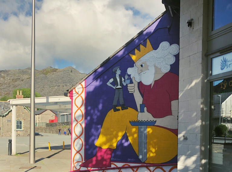 Blaenau grew as a result of the 19th century slate quarries, and it’s difficult not to see their influence on the town. Pillars of slate welcome visitors in the town centre, and across the road from the train station you’ll see colourful murals created by the local artist, Lleucu Gwenllian, which contain references to local mythology and the area’s connection to the Mabinogi.