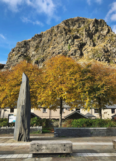 Blaenau Ffestiniog is a town that nestles between the Moelwynion mountains, winding its way along the edges of the rocks. There’s a certain thrill in reaching ‘Stiniog’ (the local short name for ‘Blaenau Ffestiniog’) over Bwlch y Gorddinan and seeing the scars of the quarry industry stretching out in front of you. Traces of its industry, history and people can be found easily on the land. One’s sights instinctively turn towards the heights – the inviting mountains for walkers, the sun bouncing brightly off slate heaps, and a few adventurers climbing way above the town. But before scaling the heights, it’s worth keeping your feet on the ground and going for a stroll around town, which is full of independent and welcoming cafes, shops, and pubs. Here you’ll see the colour that I see, and the warmth that hides beneath the slate.
