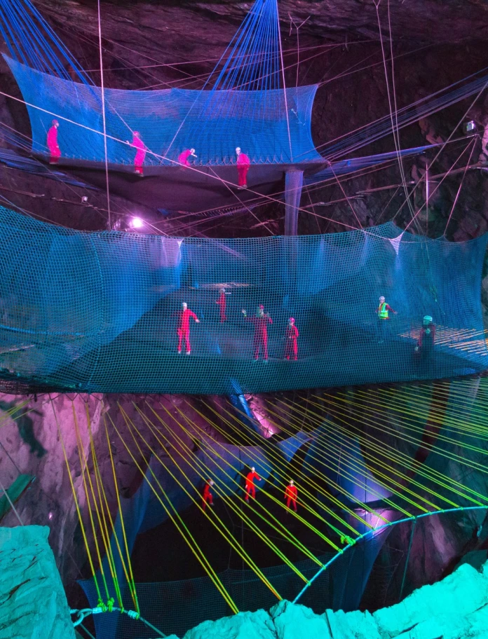At Zip World Llechwedd, the Zip World people came along and did something barking mad: installed a series of huge trampolines inside a vast underground chamber. It’s called Bounce Below. Three trampolines, one above the other, in a space that’s like an alien cathedral, all connected with slides and ladders, and lit by psychedelic, multi-coloured lights.