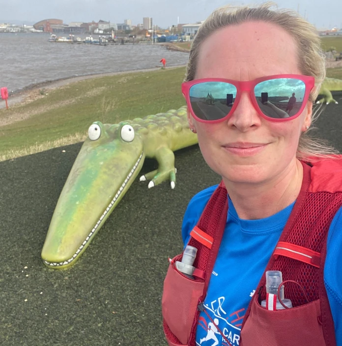 Selfie shot of a woman wearing red mirrored sunglasses and a hydration vest in front of a green crocodile sculpture.