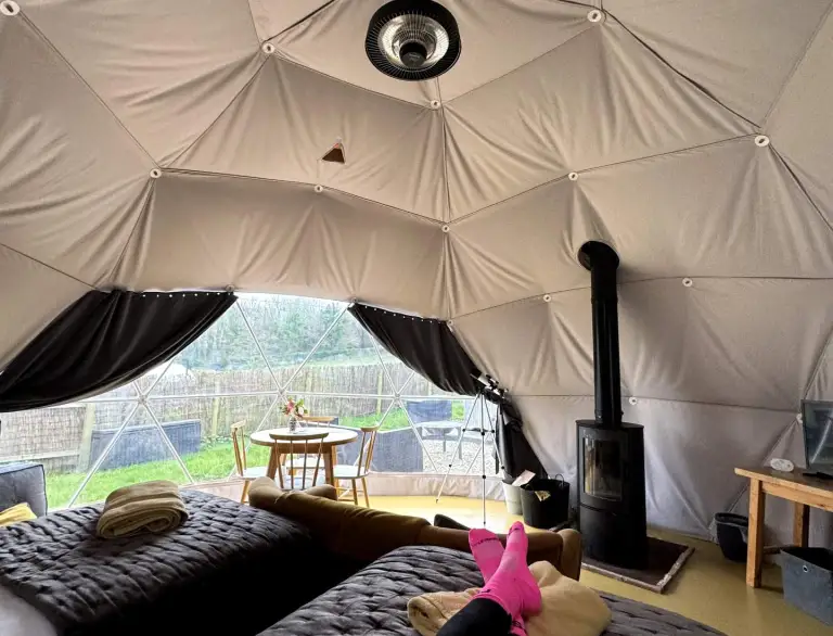 Hunger pangs well and truly vanquished, we drove from Tenby to our base for the weekend, The Little Retreat, a luxury glamping site in the grounds of an old castle in the pretty village of Lawrenny. We stayed in one of the site’s gorgeous geodomes, which appear like white canvas igloos set against the lush green Pembrokeshire landscape. Each luxurious dome comes with comfortable beds, wood-burning fireplaces and private hot tubs, with the most insane sunset views – we hopped straight in!
