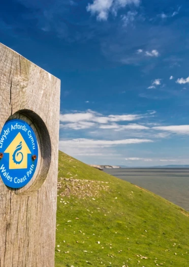 Wales Coast Path above Dunraven Bay, Southerndown, Stepping Stone at Ogmore Castle and Wales Coast Path sign