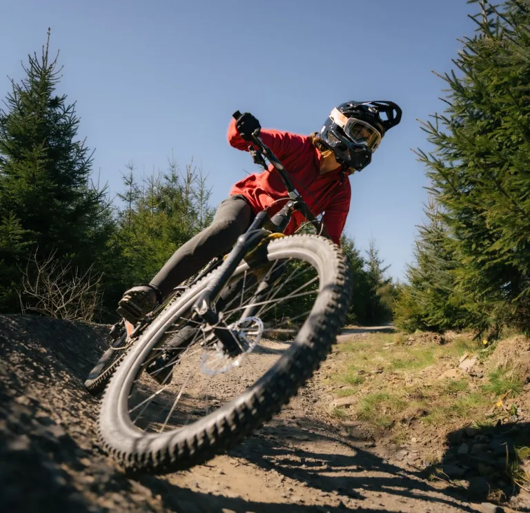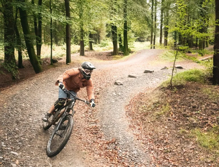 A mountain biker riding downhill on a dirt track amongst forestry.