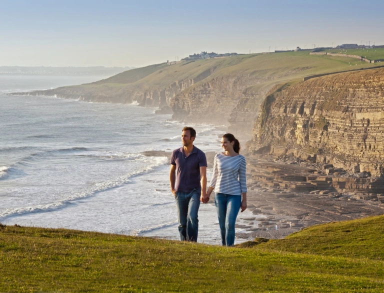 A couple walking on a coastal path with jurassic cliffs beyond.