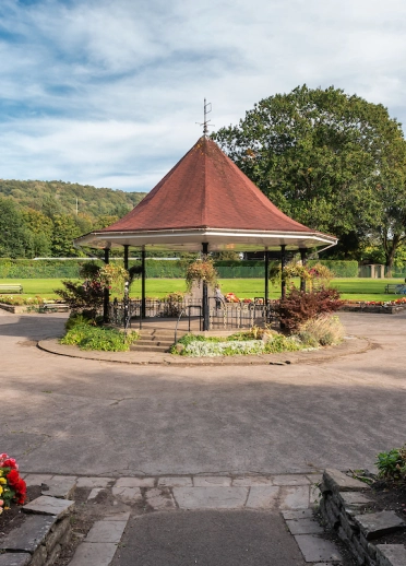 Bandstand yng nghanol parc gyda blodau lliwgar o'i amgylch ac awyr laws yn gefndir.