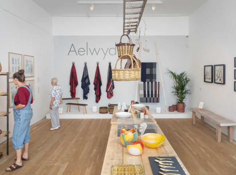 Display of crafts on table and wall with two women looking at wall artwork at Ruthin Craft Centre.