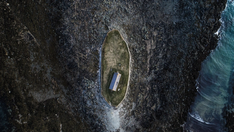 aerial view of castle and coast.