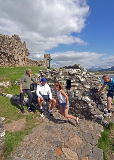 Two adults and two children exploring Criccieth Castle.