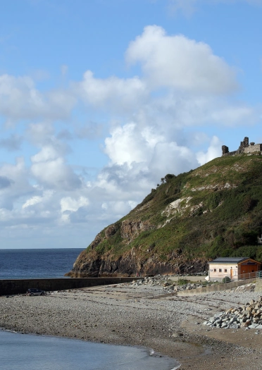 A ruined castle on a hill looking towards the coast.