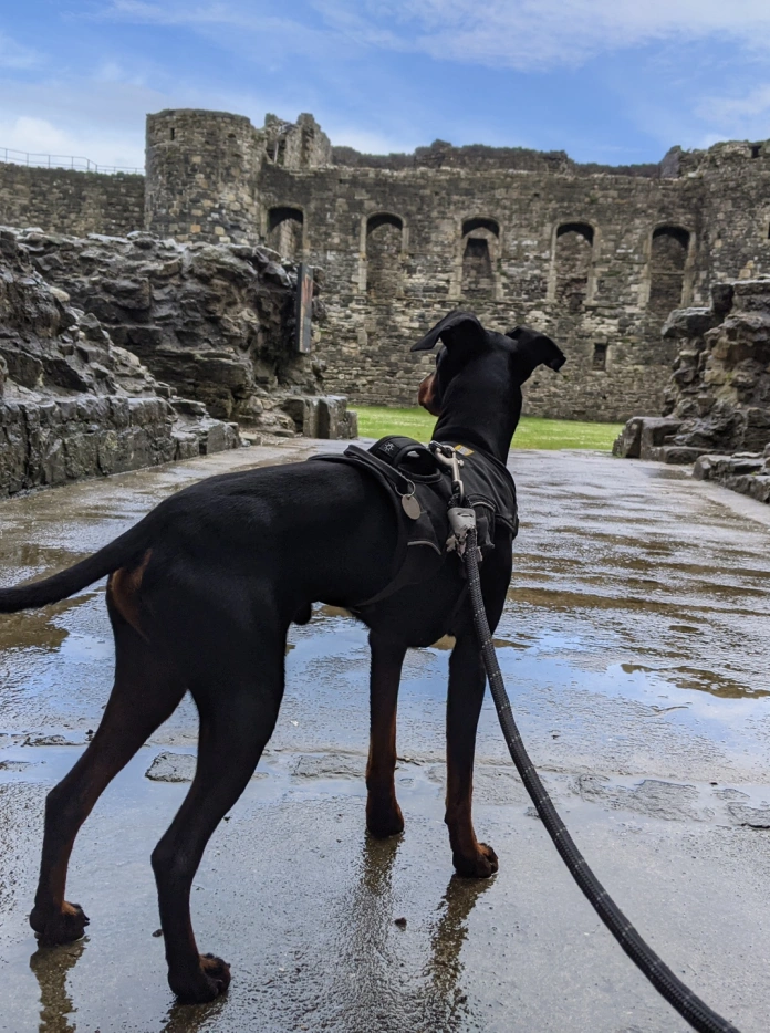 Arty the dog exploring Castell Biwmares (Beaumaris Castle), Anglesey, North Wales