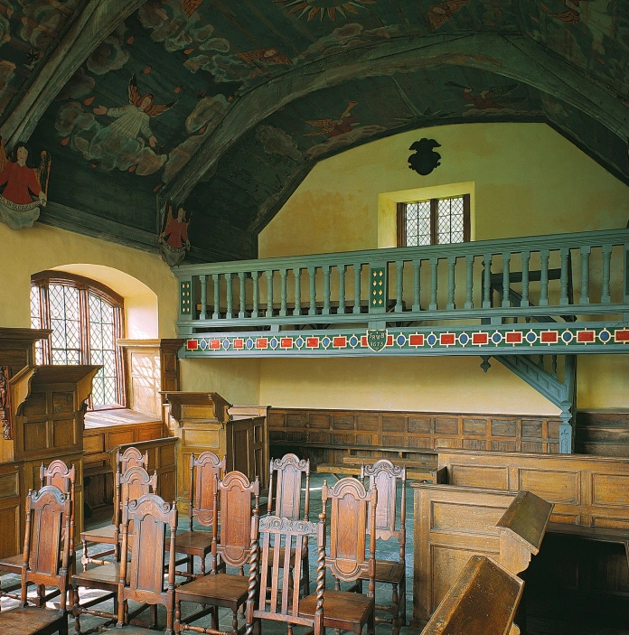 Here's another outwardly plain, private chapel hiding colourful secrets. In Rug Chapel near Corwen, 17th century colonel William Salesbury made a unique place of worship to his own high church tastes. Rose motifs, intricate wooden carvings, and surprisingly modern, abstract ceiling panels are among the many surprising delights for the eyes.
