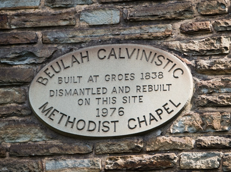 Beulah Calvinistic Methodist Chapel sign on a brick wall