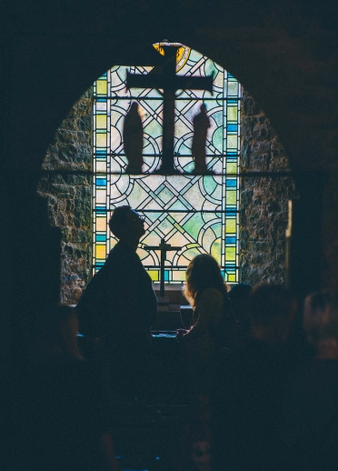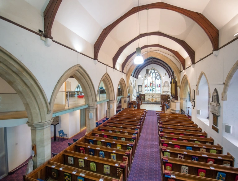 Interior of St Teilo's Parish Church, Llandeilo showing pews and a beautiful stained glass window.