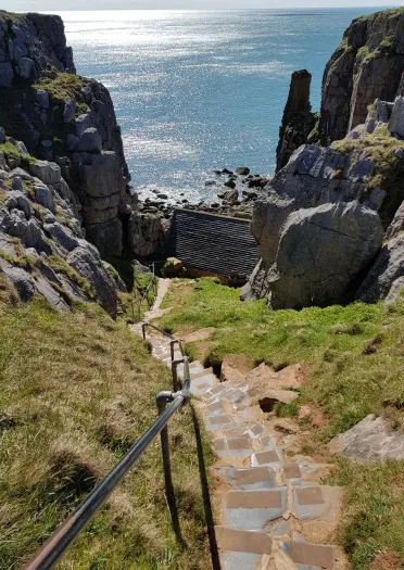 Steep steps down a cliff face towards a tiny chapel, overlooking the sea.
