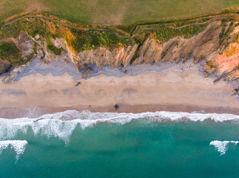 An aerial view of a beach with cliffs and the sea.
