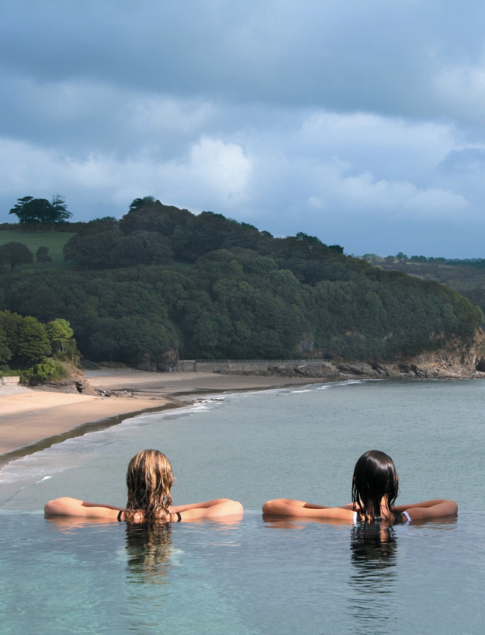 Two women looking out over the infinity pool at St Brides Spa.