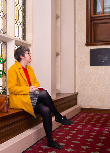 Jude Rogers sitting by a stained glass window at Celtic Manor Resort.