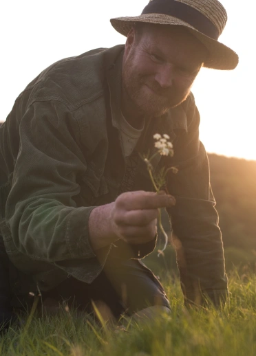 A man kneels in the grass with a wildflower