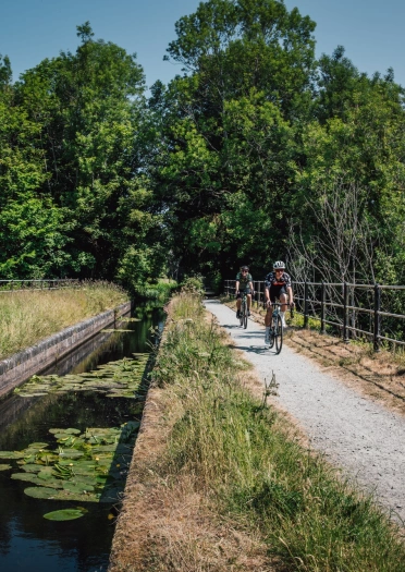 Two cyclists on a straight, hedge-lined country lane on a sunny day.