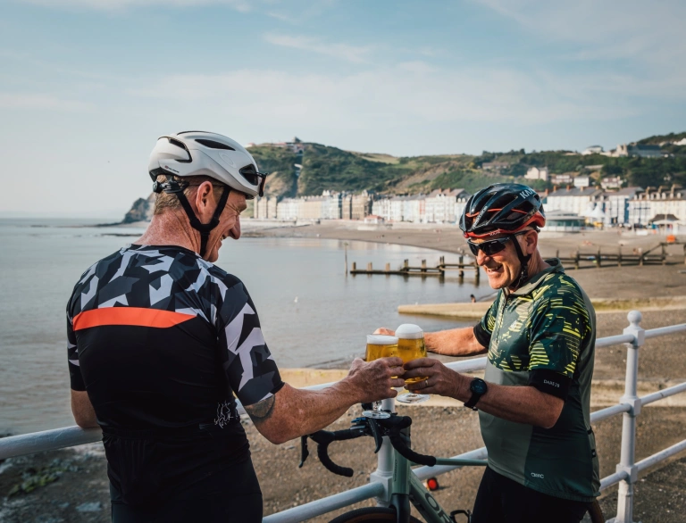 Two male cyclists raising a pint on a seaside prom with their bikes resting against railings.