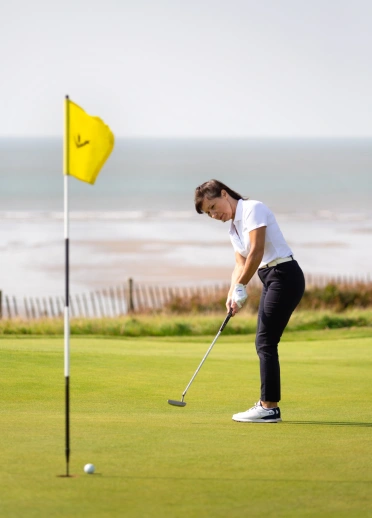 Golfer lining a putt in the hole with a golfer holding the flag at Pennard Golf Club with Pennard Castle in the background.