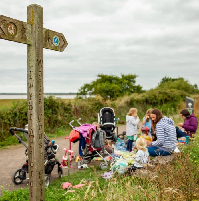 A group of parents and young children with pushchairs having a break by a Wales Coast Path sign.