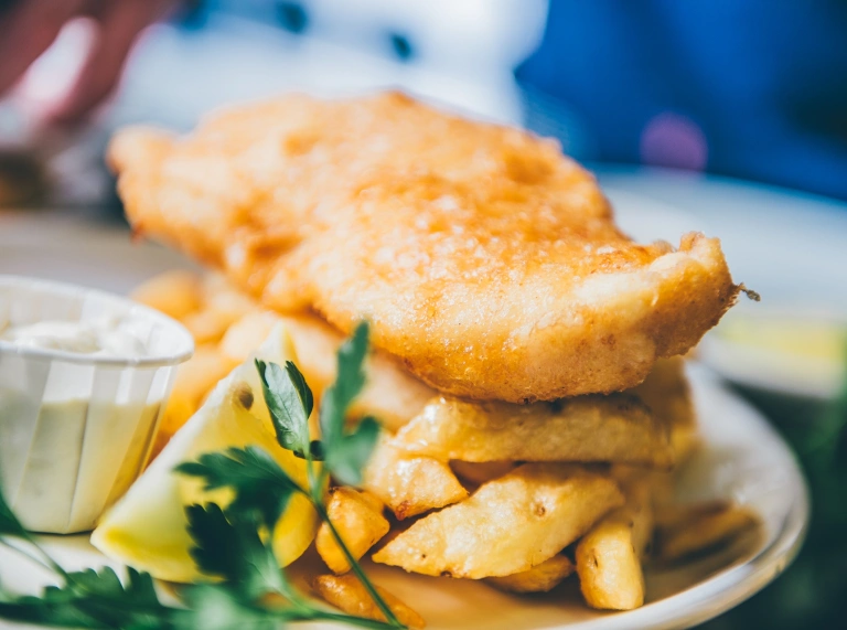 A plate of battered fish and chips.