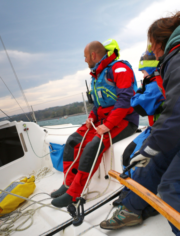 In the afternoon, the wind had picked up so Dion suggested we learn dinghy sailing. Once we'd got kitted out with safety gear and dry suits, we helped Dion get the sails up. He explained which ropes to pull when. 'The wind is usually pretty constant, but today it's from all directions!' he said.