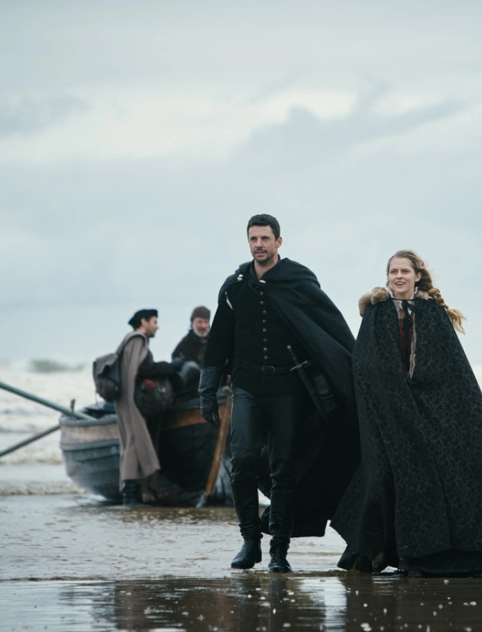 Main characters Diana Bishop and Matthew Goode on the beach.